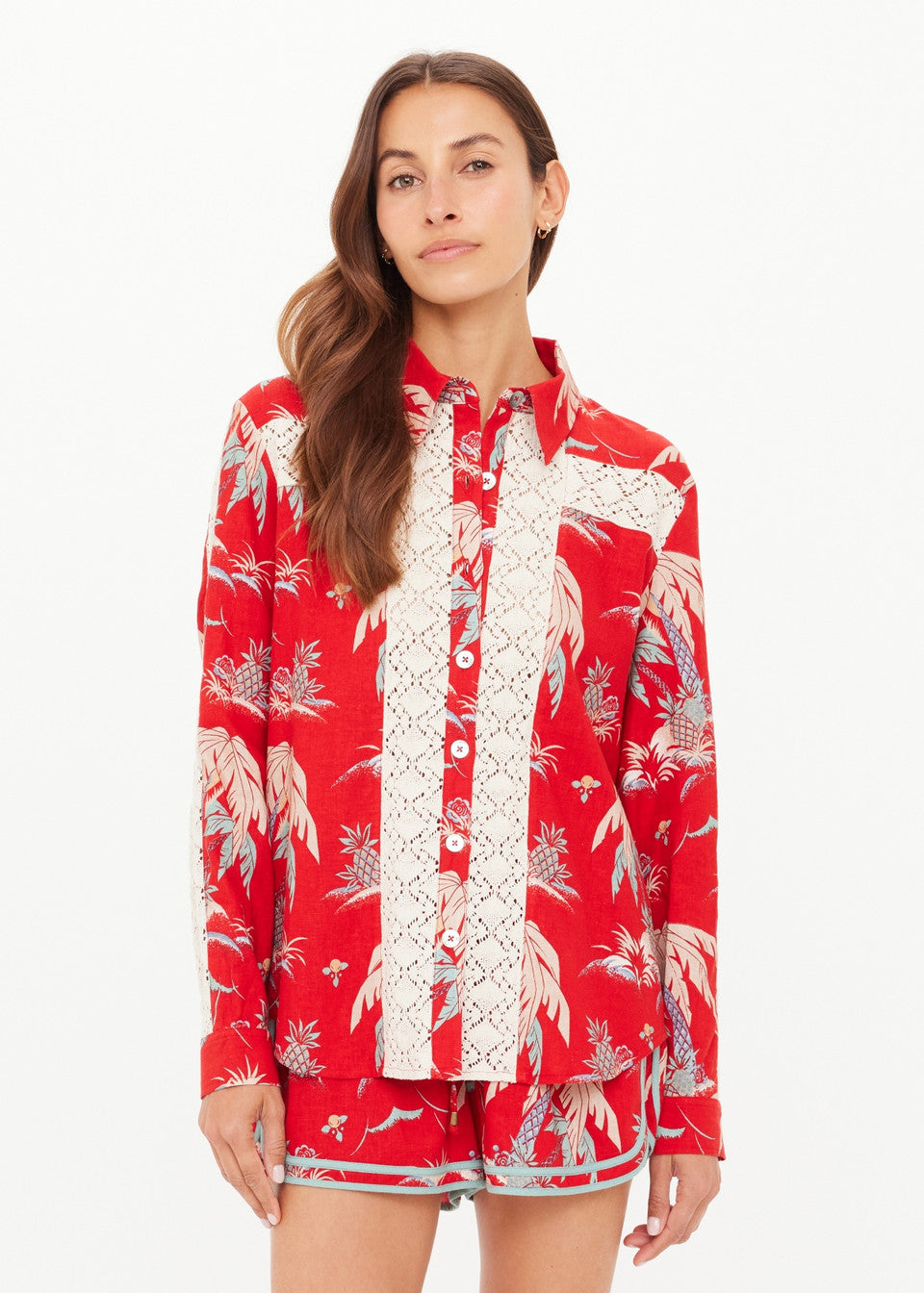Meet the Palma Bobbi Collared Shirt by The Upside, the statement button down that delivers relaxed tailoring with bold resort energy. In a saturated red tropical print with contrast lace paneling, it brings structure and personality into perfect balance.