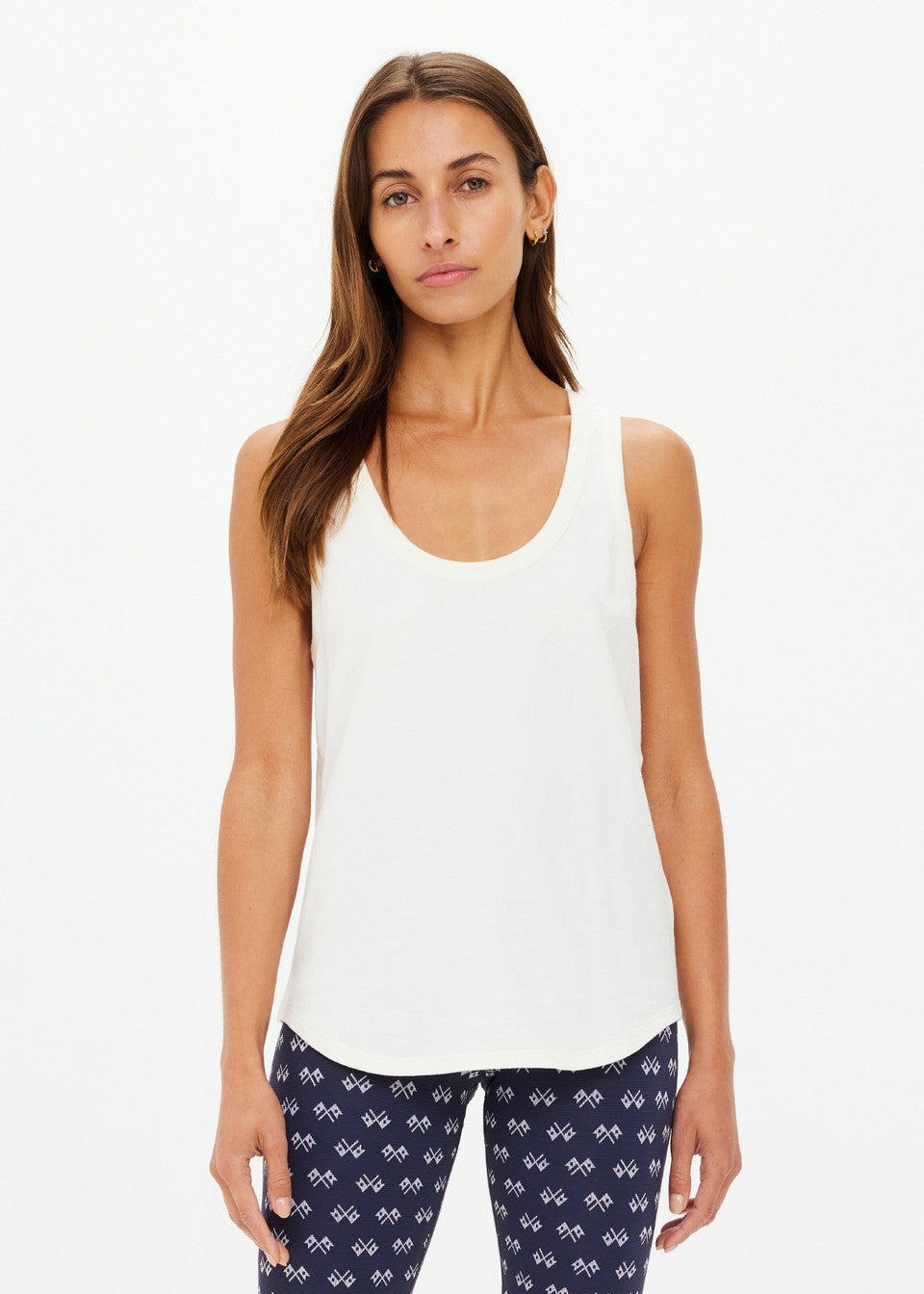 Whether you're pairing it with printed leggings or denim cutoffs, the Jacquie Tank keeps your look simple, fresh, and quietly cool. Available in a crisp creme tone, it’s designed to slot seamlessly into your everyday rotation.