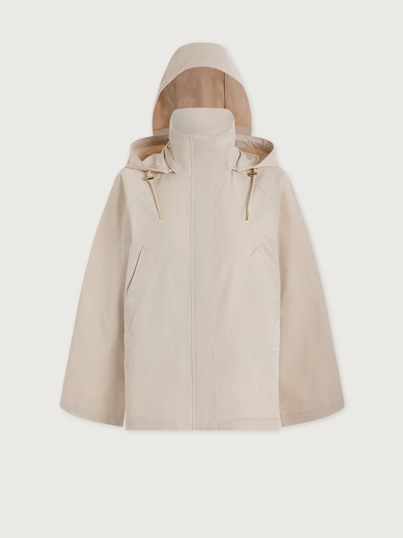 Crafted from a smooth, lightweight performance fabric, the material feels crisp, durable, and breathable for comfortable all-day wear. The high stand collar and adjustable hood provide added coverage when the weather shifts, while the concealed zip and snap closure keep the front streamlined. An internal drawcord waist allows subtle shaping, giving the jacket structure without sacrificing ease.