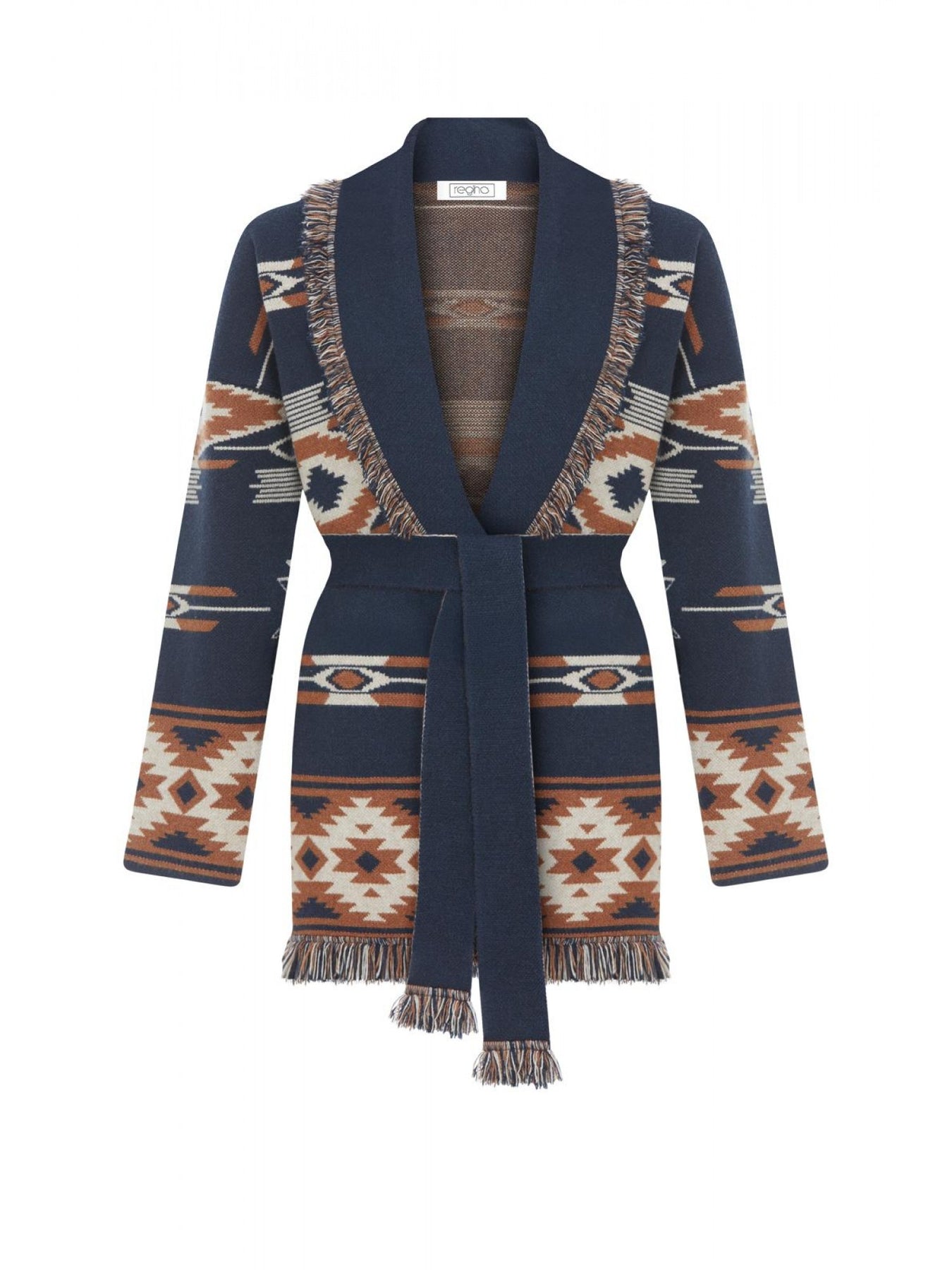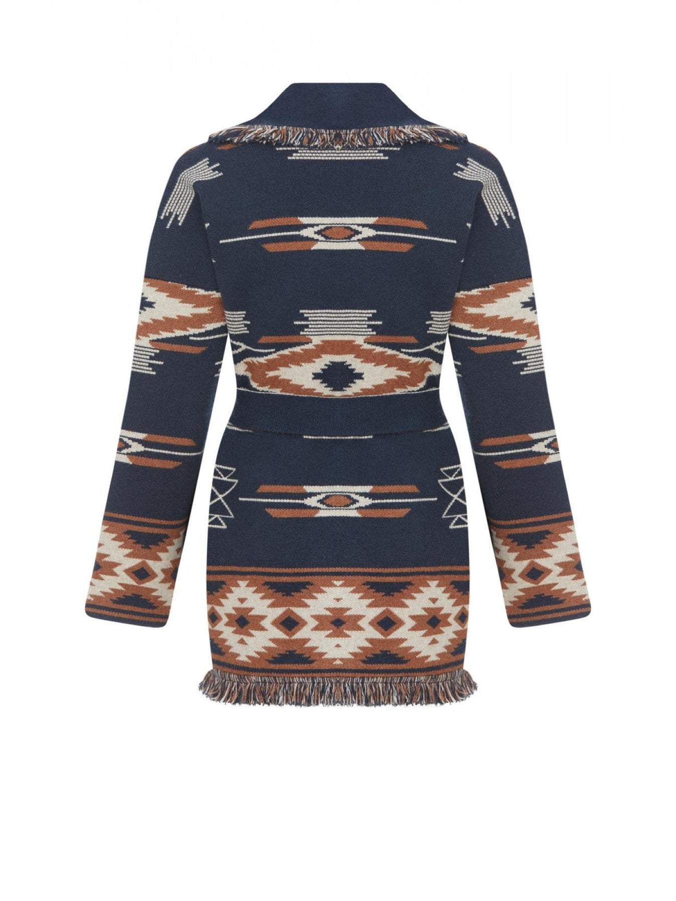 Meet the Peace Cardigan by Regino, the signature wrap layer that brings a cozy, boho edge to your athleisure lineup. Designed in deep navy with warm, Southwestern-inspired patterning, the Peace Cardigan blends laid-back luxury with everyday versatility, complete with textured fringe and a soft belted silhouette.